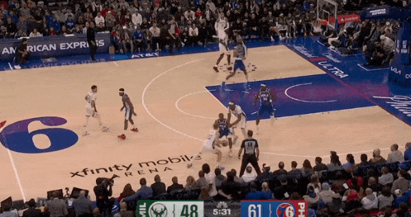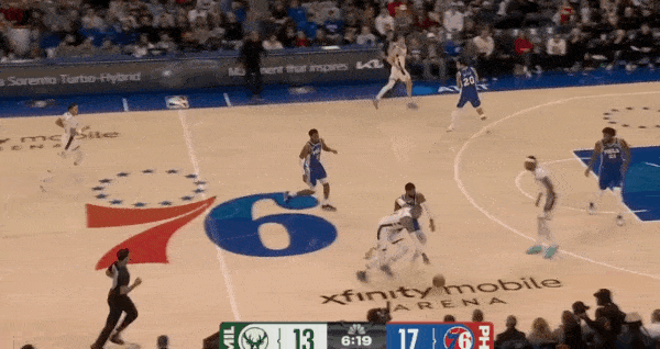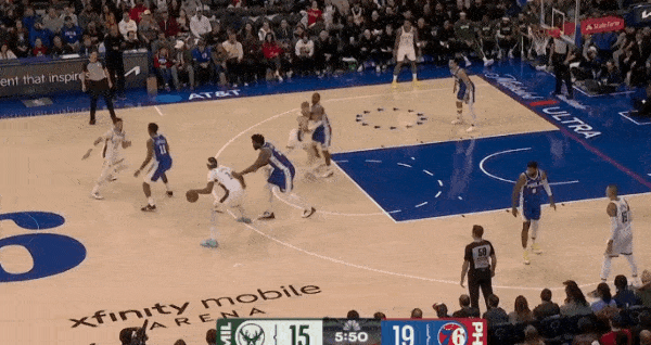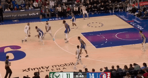 特纳先是弧顶拿球准备和罗林斯发动配合,见罗林斯无法摆脱追防人,随即选择面框单打硬解:变向启动右路突破直杀篮下,持球冲击恩比德,篮下高难度终结成功打进还有加罚。