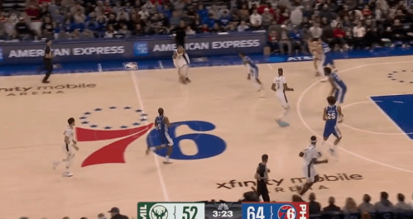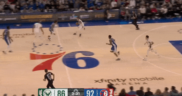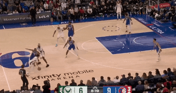 库兹马抓早期进攻突破直杀篮下吸引恩比德回退篮下,特纳顺势外拆至三分线外拉开,接球后迎着执行“折返换防”的乔治扑防——三分稳稳命中。