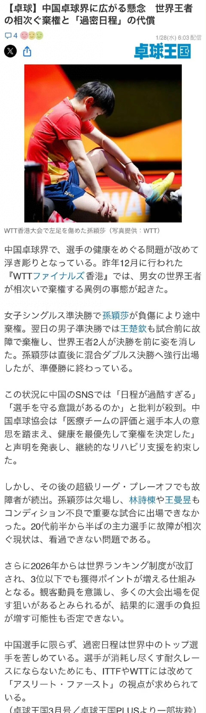 近日,日本媒体发布了一篇名为《中国乒坛隐忧浮现:世界冠军接连退赛,“密集赛程”的代价》的文章。