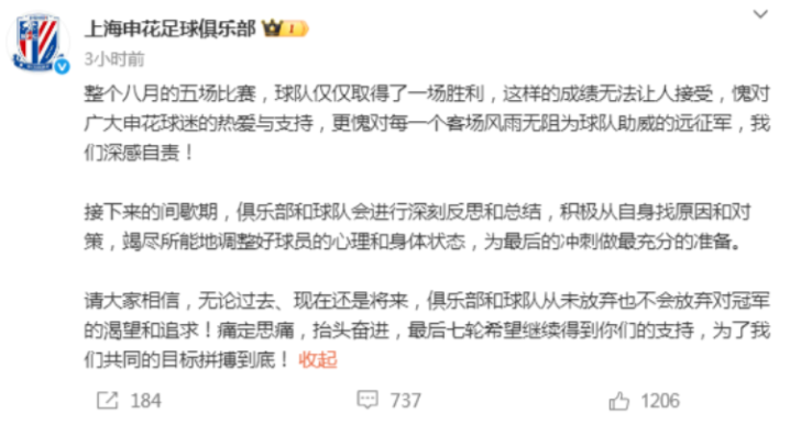 上海申花俱乐部在官微上表示,整个八月的五场比赛,球队仅仅取得了一场胜利,这样的成绩无法让人接受,愧对广大申花球迷的热爱与支持,更愧对每一个客场风雨无阻为球队助威的远征军,我们深感自责!