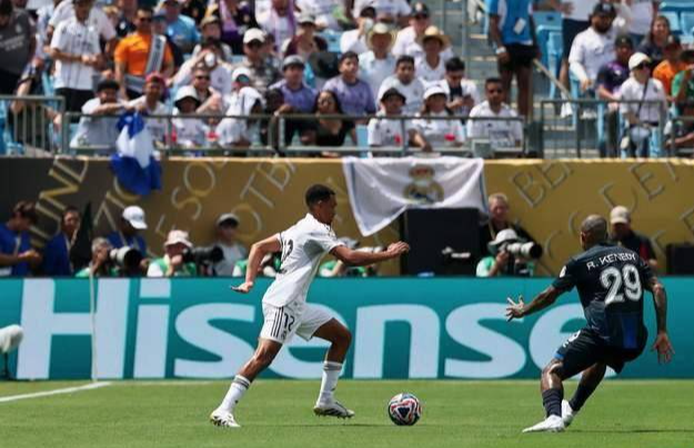 尽管人数受限,皇马仍然展现出强大的实力。第35分钟,皇马终于打破了场上的僵局。球队通过左路的配合展开进攻,弗兰·加西亚的横传找到了贝林厄姆,后者面对双人包夹毫不犹豫,左脚低射入网,帮助球队以1-0领先!这是贝林厄姆本赛季的第15粒进球,他标志性的庆祝动作在美国夏洛特的球场上重现。