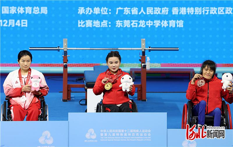 11月30日,在全国第十二届残运会举重比赛中,河北运动员郭玲玲(中)获得女子45公斤级最佳重量冠军和总重量冠军。 河北日报记者 史晟全摄