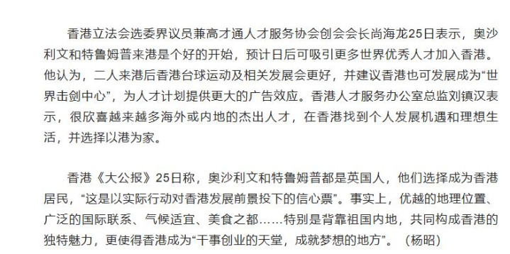 特鲁姆普已经通过香港人才引进计划,有了居民身份。