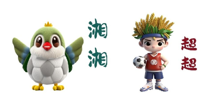 湘超联赛吉祥物“湘湘”,以常见的湖南省鸟红嘴相思鸟为设计原型,寓意湖南足球群众基础雄厚,张开的翅膀也寓意湖南足球的腾飞。吉祥物“超超”则是将超级水稻和阳光、青春的青少年足球运动员形象巧妙结合。