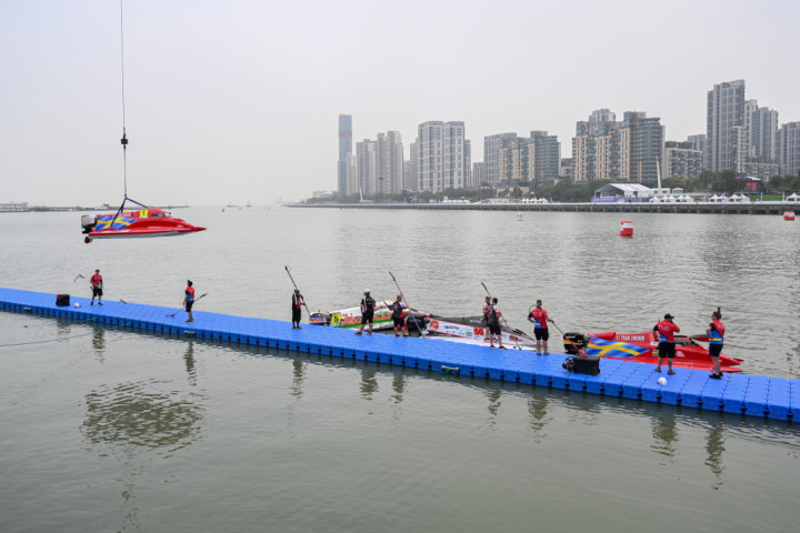 摩托艇被吊入比赛起点处。澎湃新闻记者朱伟辉图