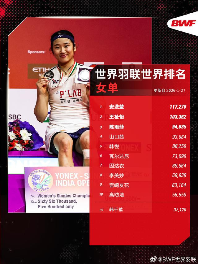 陈雨菲上升一位,来到世界第三。