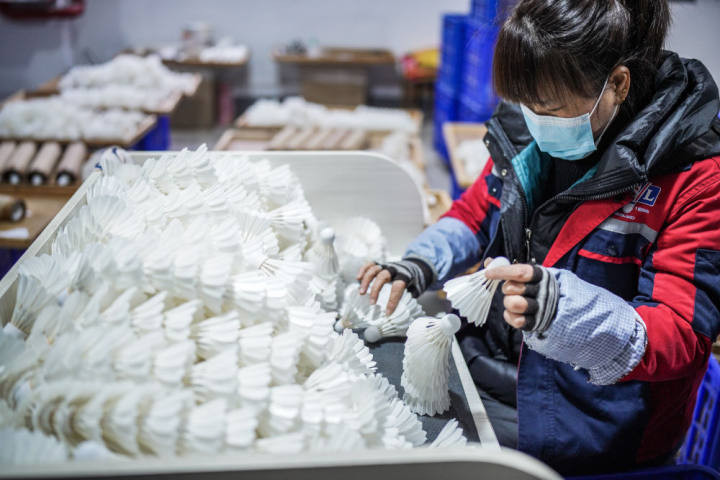 “我们统计过,全球大约每十只羽毛球,就有一只产自这里。”该公司生产经理胡兵说,当前羽毛球供不应求,一出来货就被订完了,所以他们也在开足马力、赶制订单。今年上半年,工厂生产羽毛球达230多万打,产值达1.85亿元,出口比去年同期增长了40%左右。