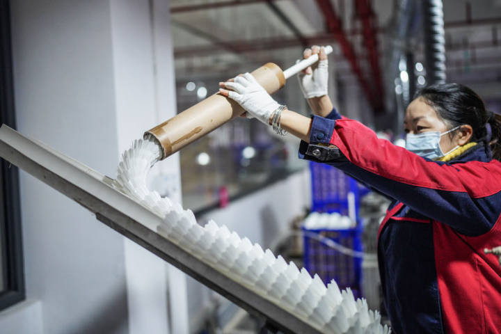 在生产车间参观时,记者看到,工厂内设有洗毛、晒毛、排毛、插头、烘干、滴胶等车间,一个成品羽毛球的生产工序多达38道。绝大多数工人以当地女性为主,她们在不同岗位上,与机器紧密协作,保证着羽毛球的质量。