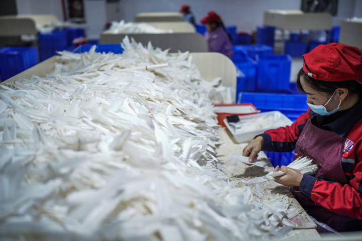 贵州省锦屏县的某羽毛球生产基地,工人在生产车间内将鹅毛挑选分类(2022年1月5日摄)。新华社记者陶亮摄